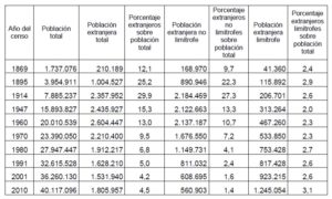 Como podemos constatar en el cuadro 2, en Argentina, las personas inmigrantes de países limítrofes constituyen desde 1869 aproximadamente 2.5% de la población total de Argentina (oscilando entre 2% y 3.1%).