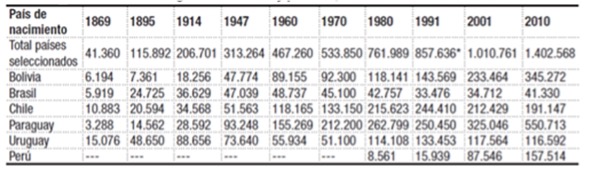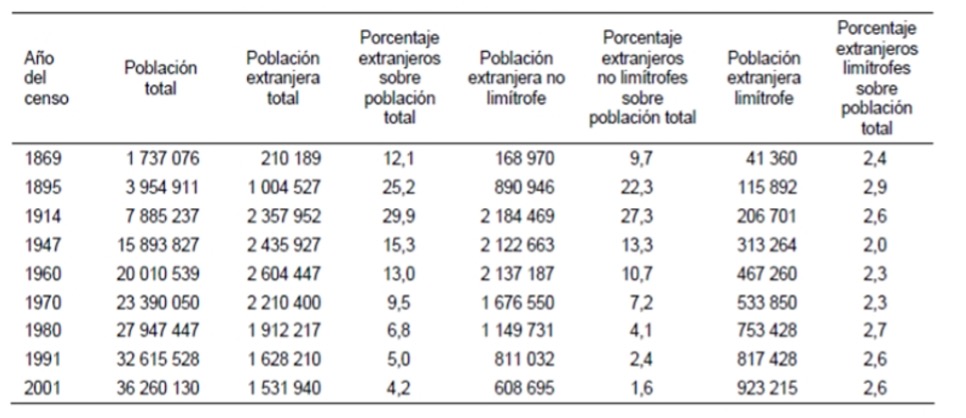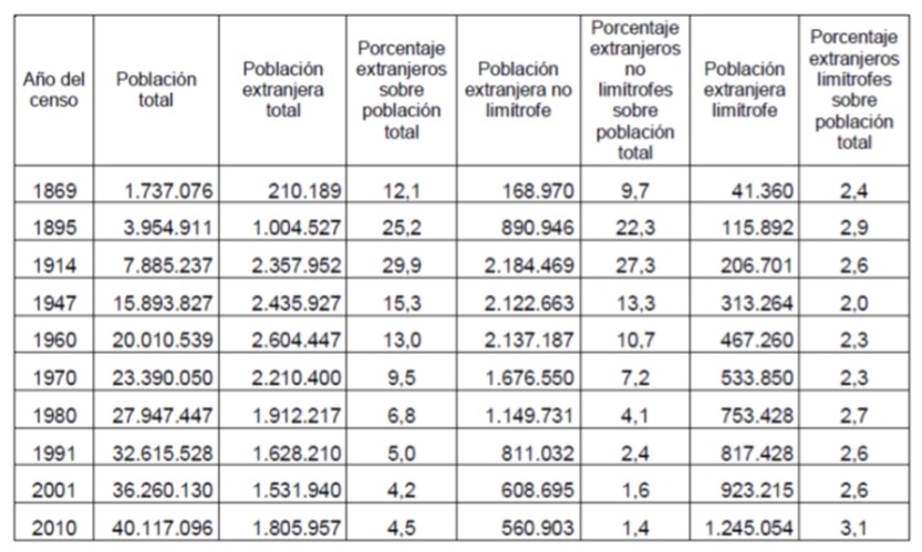 Como podemos constatar en el cuadro 2, en Argentina, las personas inmigrantes de países limítrofes constituyen desde 1869 aproximadamente 2.5% de la población total de Argentina (oscilando entre 2% y 3.1%).